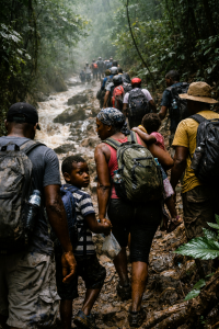 Puis est venue une autre étape de l’exil. Sous l’effet de nouvelles opportunités migratoires et de politiques d’accueil temporaire aux États-Unis, des milliers d’Haïtiens ont entrepris l’une des traversées les plus éprouvantes de notre époque : des milliers de kilomètres à pied, à travers forêts, déserts, montagnes et frontières dangereuses. Des hommes, des femmes, des enfants marchant pendant des semaines, parfois des mois, affrontant la faim, la peur, la violence et l’incertitude, avec pour seul objectif offrir un avenir plus stable à leurs familles.